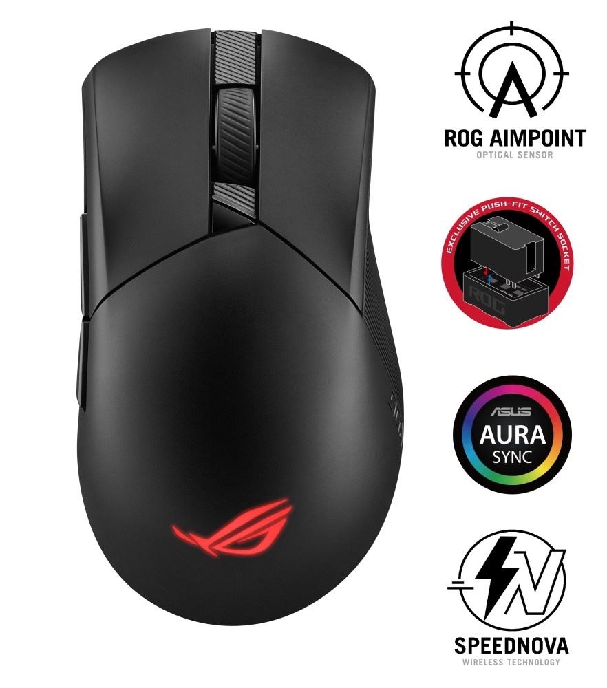 Soclu de întrerupător Push-Fit Switch II : Design de întrerupător interschimbabil pentru o personalizare ușoară; Gladius III Wireless AimPoint include micro întrerupătoare ROG și este compatibil cu alte micro întrerupătoare mecanice cu 3 pini și optice cu 5 pini
