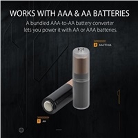 Funcționează cu baterii AA sau AAA prin intermediul carcasei de reducere a greutății incluse, care reduce greutatea cu 10%