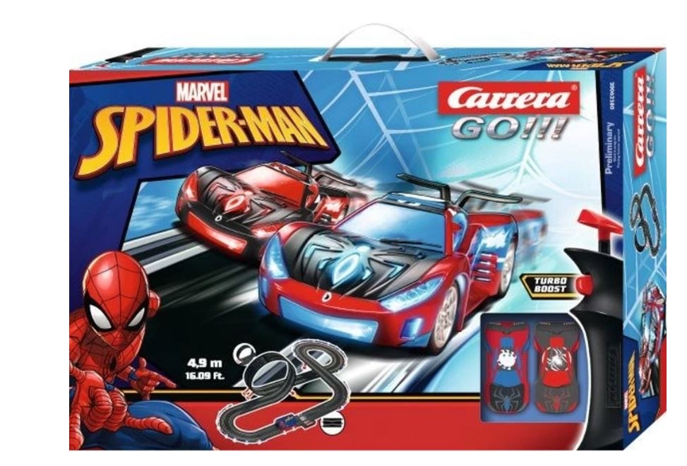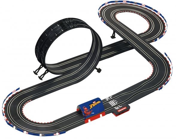 Pistă de curse Carrera GO - Spider Racing. Experimentați emoția și aventura cu pista Carrera GO!!!, care măsoară 4,9 metri și este echipată cu superbele mașini Spider-Man! Această pistă este ideală pentru toți fanii supereroilor și ai vitezei. Mașinuțele Spider-Man vă aduc nu doar viteză, ci și distracție la fiecare cursă. Include looping, poduri, linii drepte, curbe, îngustarea pistei și o piesă de alimentare care asigură experiențe variate de curse. Datorită altor piese, puteți construi diverse trasee după imaginația dvs. și puteți schimba astfel fiecare experiență de cursă.