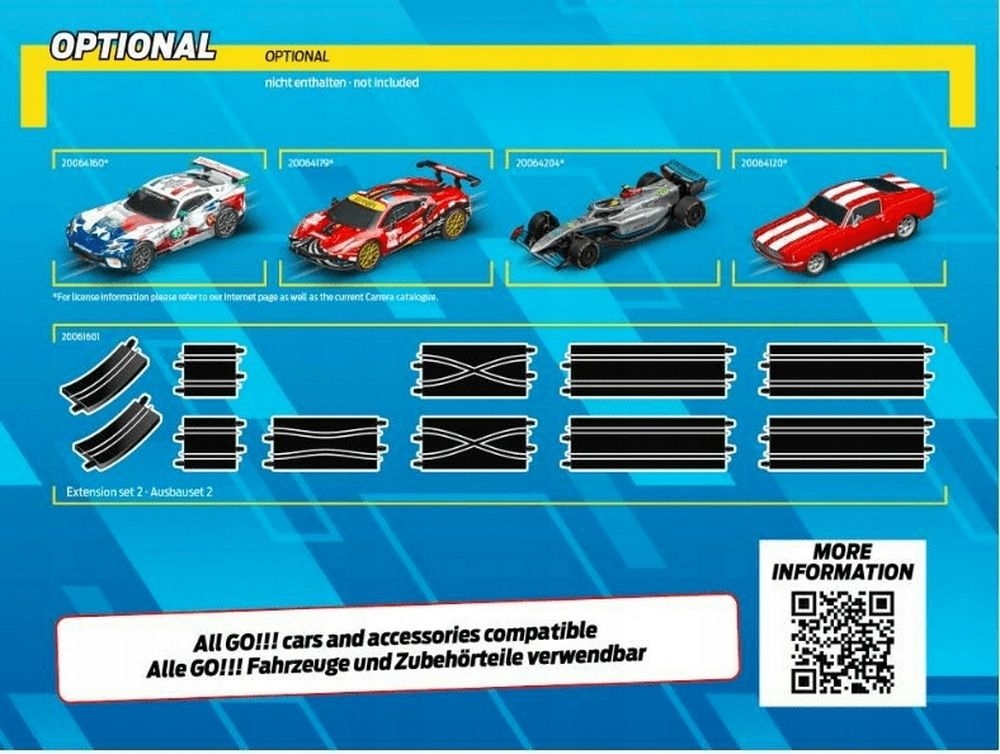 Inclus: Pistă, 2 mașini, linii drepte, colțuri, jumper, parte electrică, 2x regulator de viteză, suporturi, manșoane, instrucțiuni.