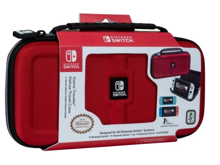 Husa de călătorie roșie de lux vă păstrează consola de jocuri Nintendo Switch în siguranță oriunde mergeți. Husa dispune de un suport reglabil și de un cursor de calitate. Pe lângă consola de jocuri, în husă se pot depozita și accesoriile de protecție Action Grip pentru controllerele Joy-Con și capacele de protecție Thumb Grip pentru stick-urile analogice. Pachetul include două huse din plastic pentru cardurile de joc și o husă pentru cardul microSD.