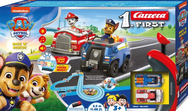 Trăiți curse palpitante cu îndrăgiții eroi canini din serialul Paw Patrol! Pista Carrera FIRST Paw Patrol cu o lungime de 3,5 metri este ideală ca prima pistă pentru copii de la 3 ani și oferă multă distracție, lumini, sunete și elemente interactive.