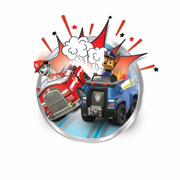 Setul de cursă conține tot ce au nevoie copiii pentru a porni imediat – mașinuțele Chase și Marshall, curbe, drepte, două porți de cursă și decorațiuni colorate cu motive din serialul animat îndrăgit. Datorită sistemului simplu de asamblare, pista se montează și demontează ușor, astfel încât distracția poate începe în scurt timp.