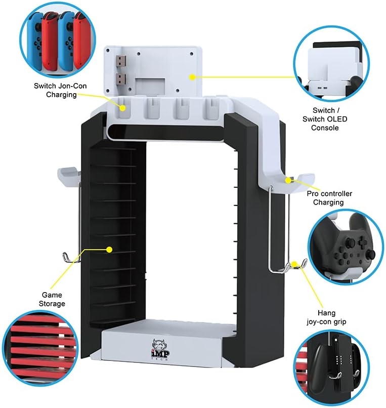 Alimentat de adaptorul de curent alternativ Switch (nu este inclus), acest suport multifuncțional care economisește spațiu vă permite să vă încărcați controllerele de joc și oferă spațiu de depozitare pentru consola, jocurile, controllerele și accesoriile dvs.