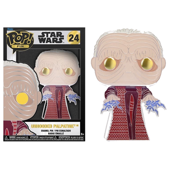 Insigna are o înălțime de aproximativ 10 cm, la fel ca și Funko Pop pe care se bazează. Insigna nu are doar un spate standard pentru a fi prinsă cu acul, ci și un suport pentru acul "Funko Crown" care îi permite să stea în picioare!
