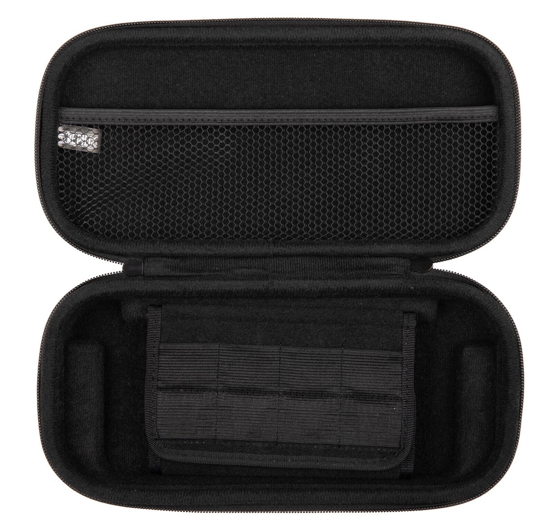 Husa are un mâner pentru a fi transportată ușor și o închidere cu fermoar. În interior are un buzunar cu plasă pentru depozitarea accesoriilor suplimentare, cum ar fi joy-cons sau cabluri. Protecția pentru ecran are 8 buzunare pentru depozitarea cărților de joc.
