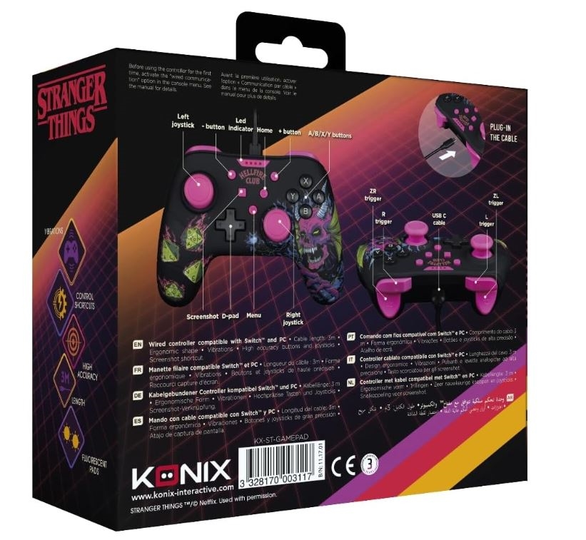 Pregătește-te pentru o aventură în lumea misterioasă a Hawkins cu Konix Stranger Things Black Controller. Acest controller pentru Nintendo Switch și PC combină un design întunecat inspirat din popularul serial Stranger Things cu confort excelent și control precis. Ideal pentru orice fan care dorește să trăiască atmosfera acestui serial captivant și să se bucure în același timp de o experiență de joc de calitate.