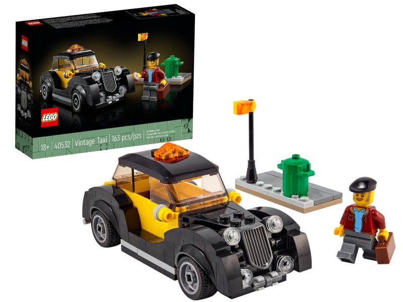 În plus față de vehiculul galben și negru, taxiul retro include o mică bucată de peisaj stradal, cu excremente ascunse într-un coș de gunoi verde, și o minifigurină. Setul este conceput pentru adulți și conține 163 de piese.