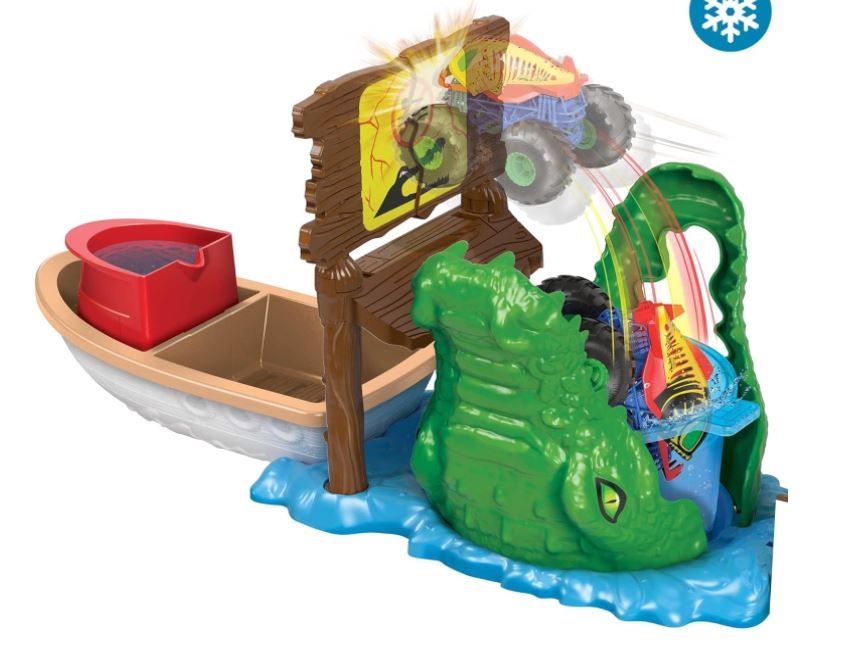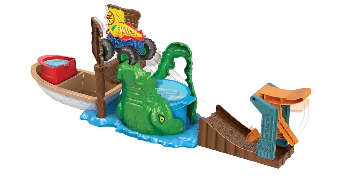 Întrece-te cu Hot Wheels Monster Trucks Color Shifters pentru a câștiga și a-ți asigura dreptul de a te lăuda! Încearcă să sari peste gura crocodilului fără să cazi în apă pentru ca crocodilul să nu te mănânce, încearcă să sari până la barca pregătită. În apa rece și caldă mașina își va schimba culoarea. Setul include rampă de sărituri, gură de crocodil, barcă și mașină Piran.