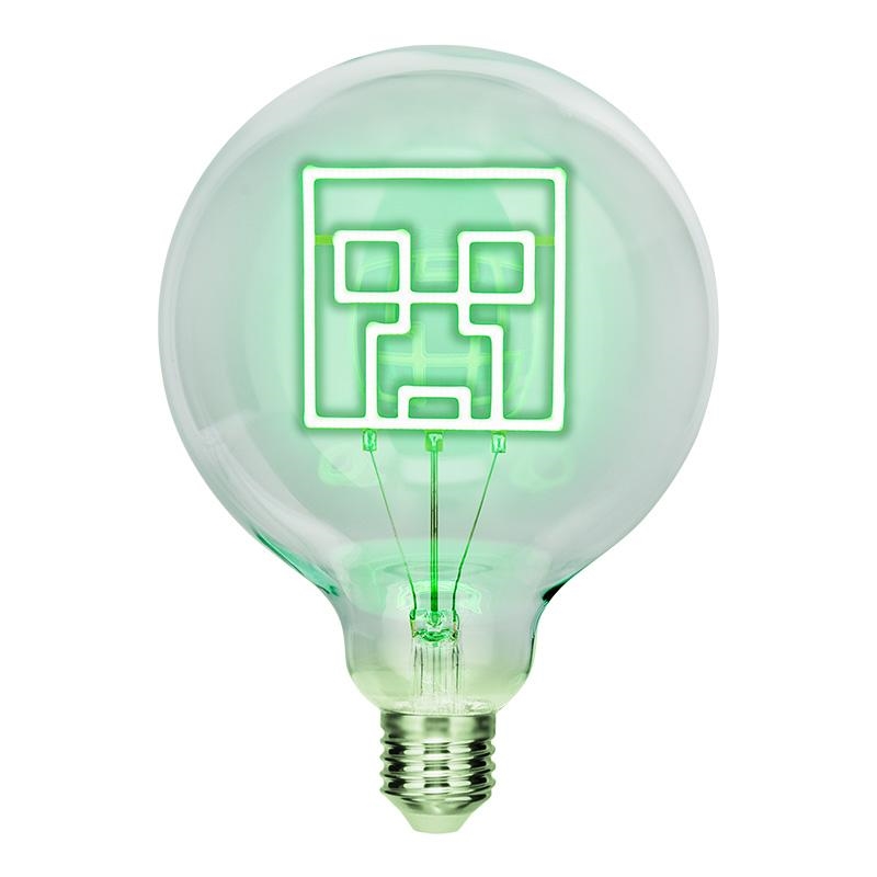 Filamentul LED din acest bec decorativ are forma unui Creeper. Se înșurubează în orice soclu E27. Când rotiți întrerupătorul, strălucirea verde vie oferă casei dvs. o nuanță colorată.