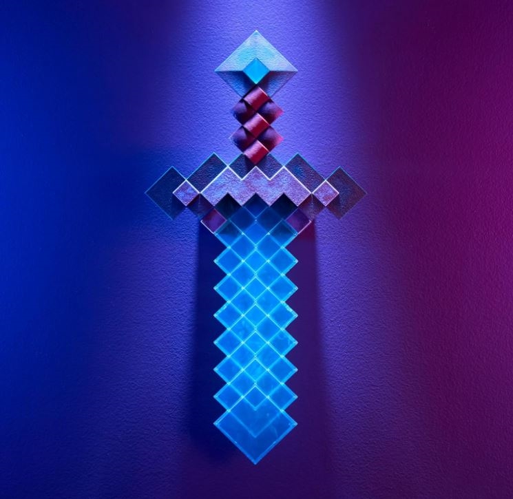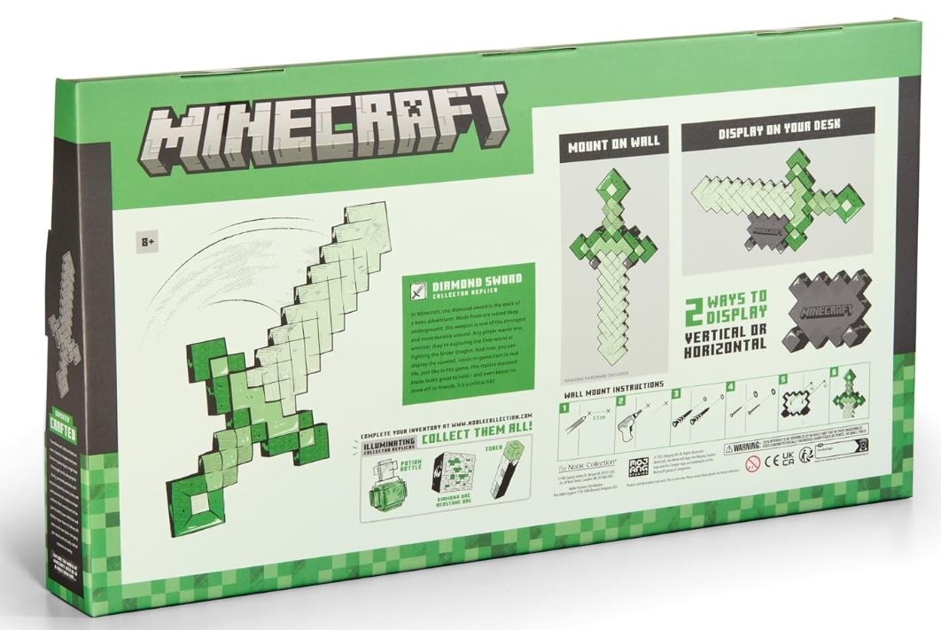 Această sabie are o lungime de 50 cm și o lățime de 25 cm. Este un adevărat obiect de sărbătoare pe care să îl adăugați la colecția dumneavoastră. Sabia este însoțită de un suport în relief cu logo-ul Minecraft, care poate fi folosit ca suport de perete sau de masă.