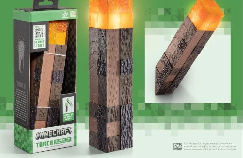 O replică de colecție a torței pe care o știi din Minecraft. Detaliat. Lanterna strălucește, pentru a obține efectul de strălucire aveți nevoie de baterii AAA, care nu sunt incluse în pachet. Dimensiuni: 27,80cm X 11,00cm X 7,00cm. Licență oficială.