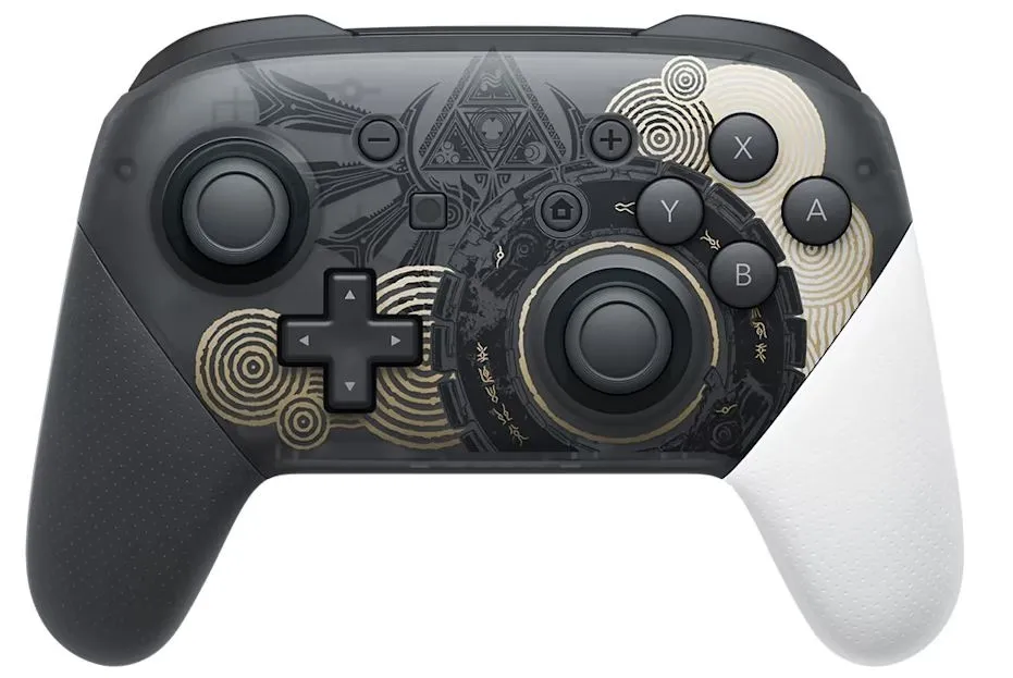 Gamepad pentru Nintendo Switch. Designul alb-negru cu detalii aurii sporește frumusețea controlerului și evidențiază faptul că acesta provine dintr-o ediție specială concepută pentru The Legend of Zelda: Tears of the Kingdom. Pornește într-o aventură epică pe tărâmul și pe cerul din Hyrule cu Pro Controller-ul pentru Nintendo Switch™ - The Legend of Zelda: Tears of the Kingdom Edition!