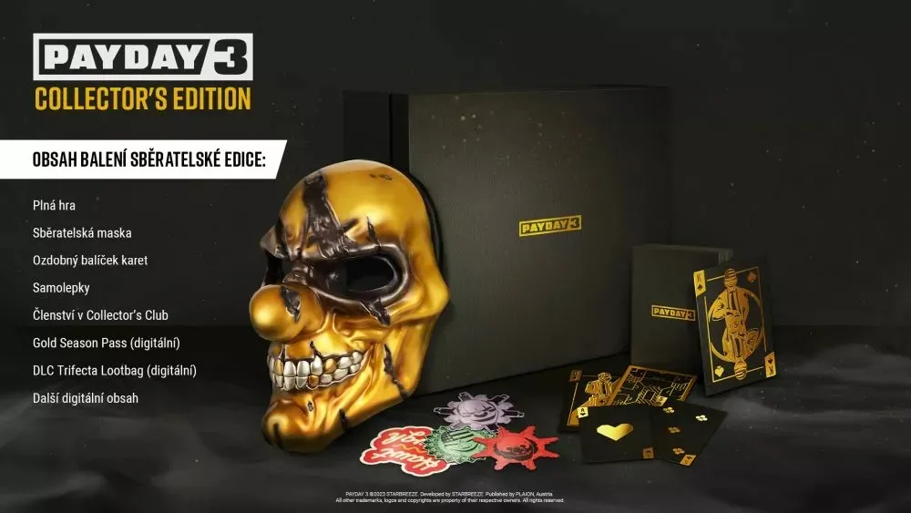 - calitate de membru în The Collector's Club (online) - calitate de membru exclusiv în comunitatea închisă disponibilă doar deținătorilor ediției de colecție; acești membri vor primi o invitație la discuții online cu dezvoltatorii PAYDAY 3 și vor obține acces la alte oportunități exclusive.