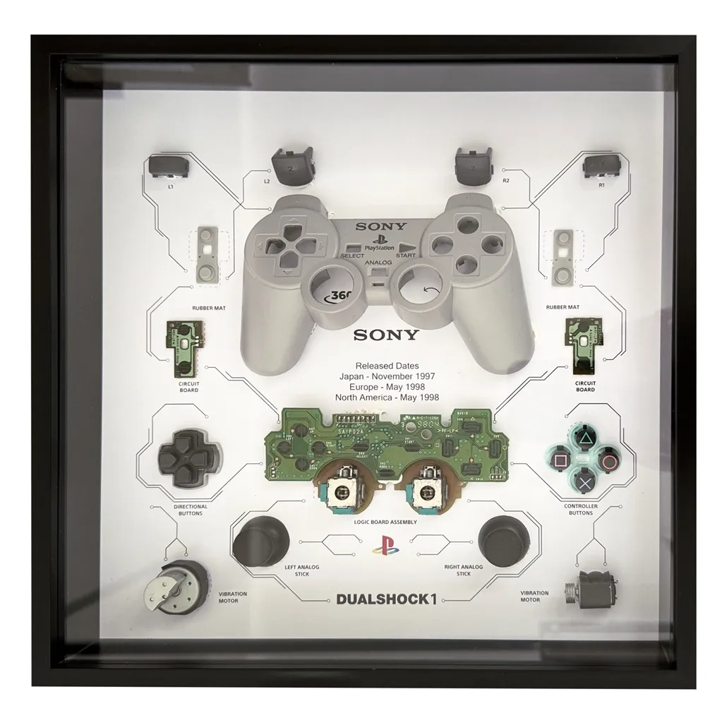 Decorațiune originală pentru camera oricărui jucător căruia îi place gamingul retro! Examinează fiecare componentă care se află în interiorul controlerului Dualshock 1 pentru PlayStation 1 în această cutie de umbră, care cu siguranță va atrage atenția.