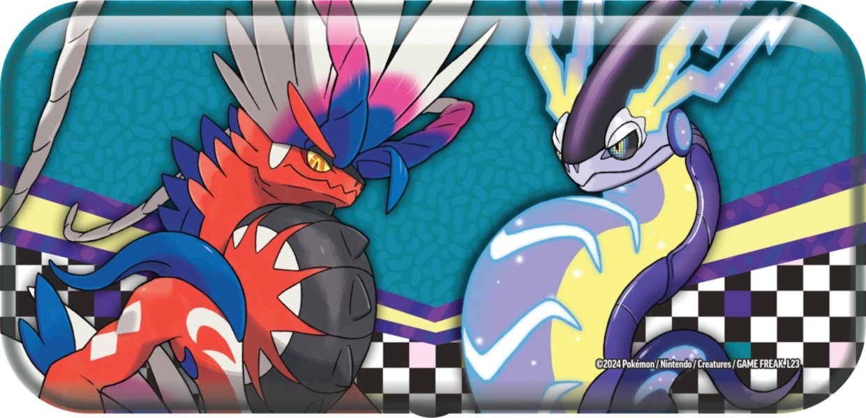 O carcasă de metal cool pentru creioane din seria Back to School care conține 2 pachete de rezervă Pokémon! Cutia pentru creioane prezintă un Charizard înflăcărat pe o parte și Pokémon legendari Koraidon și Miraidon pe cealaltă!