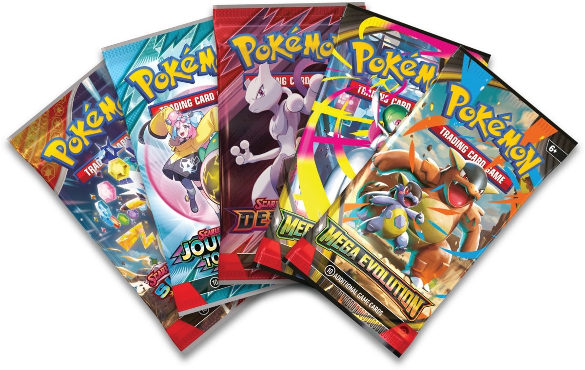 5x pachete booster cu câte 10 cărți aleatorii din edițiile Surging Sparks, Journey Together, Destined Rivals, Mega Evolution