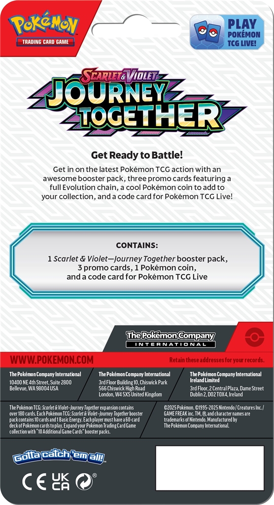 Antrenori cu încredere profundă și conducere fermă îi ajută pe Pokémonii lor să arate cel mai bun ce au în ei. Legătura pe care o împărtășesc le dă puterea de a acționa ca unul în luptă, împingându-și limitele, chiar și ca Pokémoni ex! Alăturați-vă cu antrenorul N și ex Zoroark, ex Bellibolt Iono, ex Clefairy Lillie, ex Zacian Hopa și alți Pokémoni antrenori și descoperiți forța de neoprit a prieteniei în extinderea Pokémon TCG: Scarlet & Violet - Journey Together!