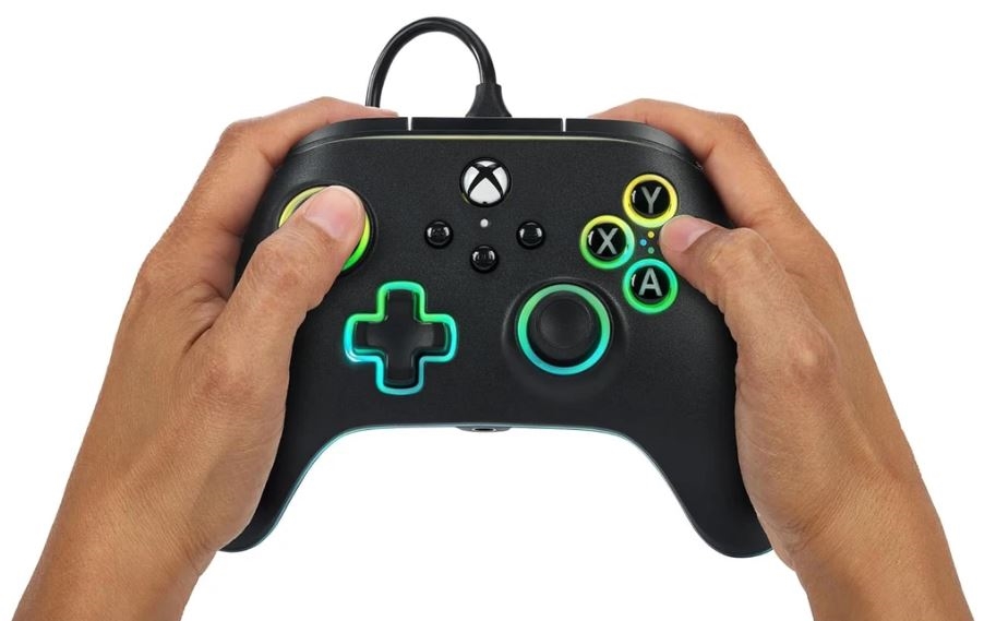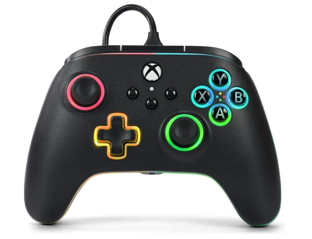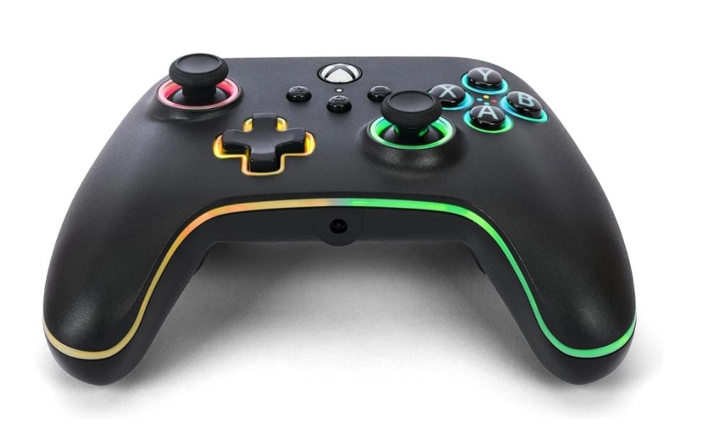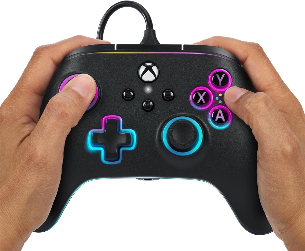 Controlerul de joc cu fir PowerA Advantage Lumectra pentru Xbox Series, Xbox One și PC este plin de caracteristici pentru o experiență de joc de ultimă generație. Dispune de un jack (mufă de 3,5 mm), un cablu USB-C detașabil de 3 m, un buton de partajare, o dispunere intuitivă a butoanelor, blocarea declanșatorului în trei direcții, răspuns tactil, motoare duble de rumble și iluminare RGB cu mai multe zone.