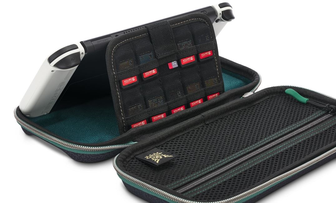 Păstrați cablurile acoperite, căștile și alte accesorii mici în buzunarul cu plasă. Un separator intern căptușit asigură o protecție suplimentară a ecranului. În plus, husa poate conține până la 10 carduri de joc Nintendo Switch.