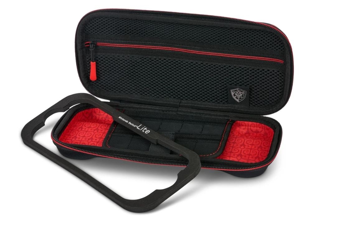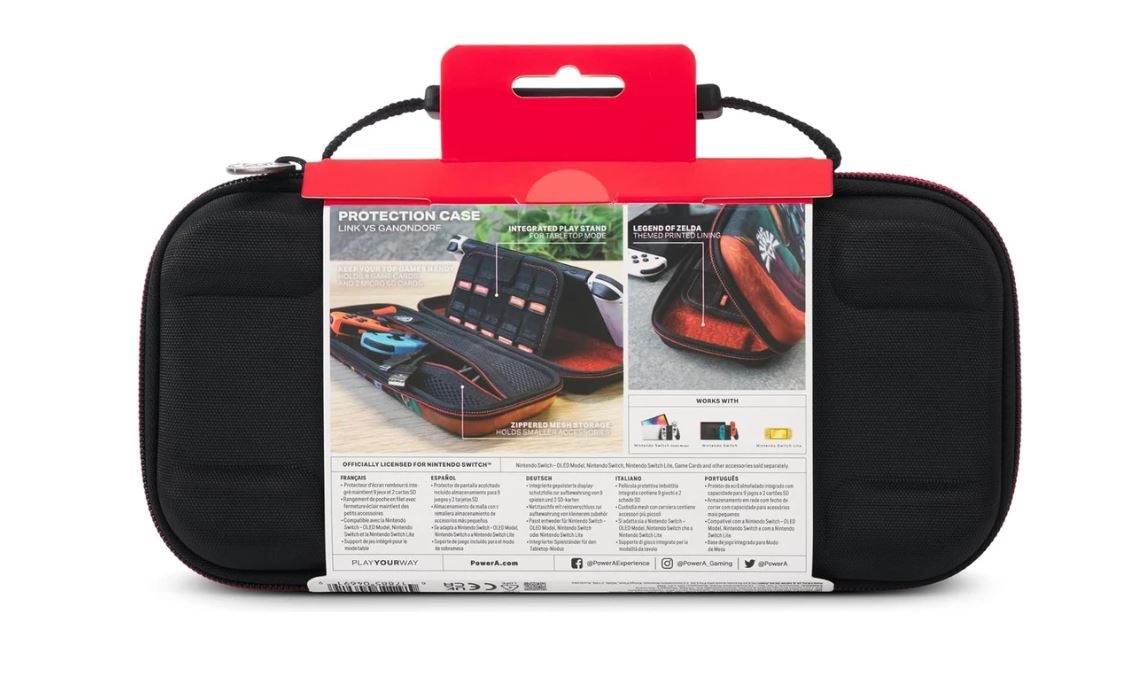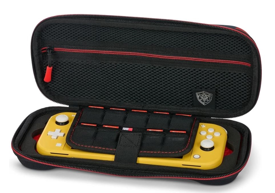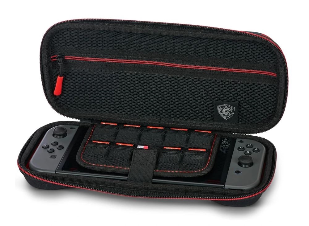 Păstrați cablurile acoperite, căștile și alte accesorii mici în buzunarul cu plasă. Un separator intern căptușit asigură o protecție suplimentară a ecranului. În plus, husa poate conține până la 10 carduri de joc Nintendo Switch.