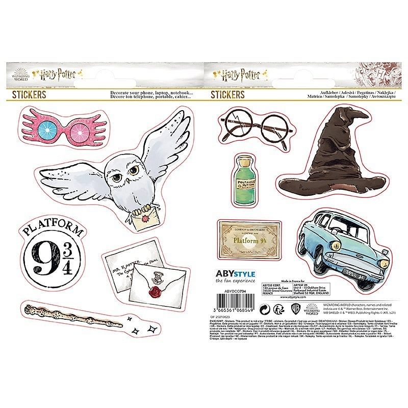 Sada obsahuje 2 aršíky samolepek s motivy z Harry Pottera, jako jsou např. Moudrý klobouk, sova Hedvika, symbol Nástupiště 9 a 3/4, brýle Lenky Láskorádové a další. Vhodné pro vyzdobení např. vašeho laptopu nebo smartphonu.