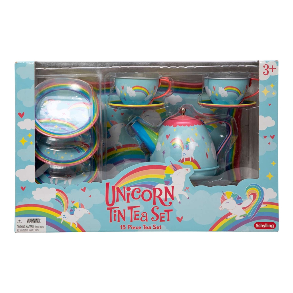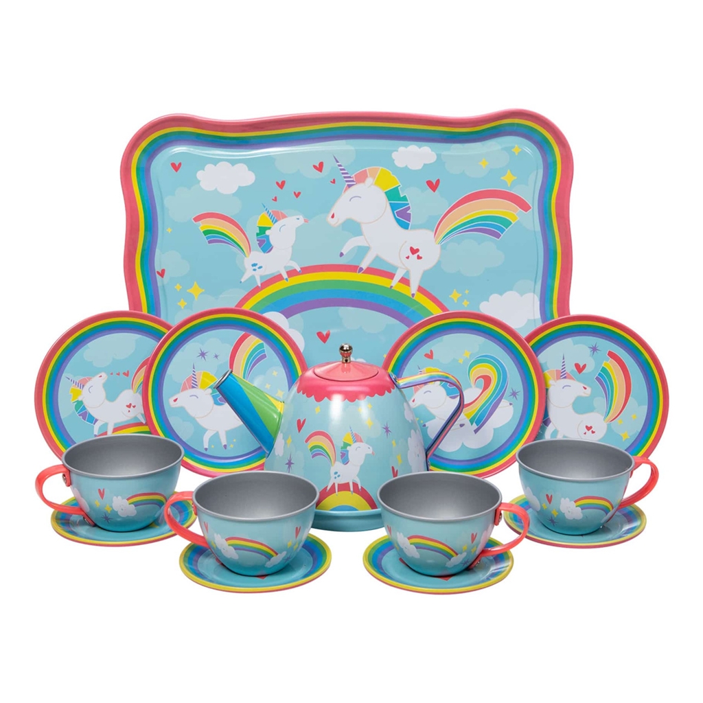 Je čas na čaj. Krásná 15 dílná čajová sada vyrobená z kovu, obsahuje 4 šálky s podšálky, 4 dezertními talířky, konvici na čaj s pokličkou a servírovací tác, vše v designu jednorožce. Rozměr servírovacího tácku je 24x16 cm. Kreativita stoupá, když Vaše ratolesti hostí kamarády, panenky a plyšové hračky s nejsladší čajovou sadou všech dob. Vhodné pro malé hostitele a hostitelky ve věku od 3 let. Hlavní vlastnosti: 15dílná čajová sadaideální pro předstírané čajové dýchánkydesign s motivem jednorožce. Rozměry balení: 30,8x9,5x19,7\Věk: 3+