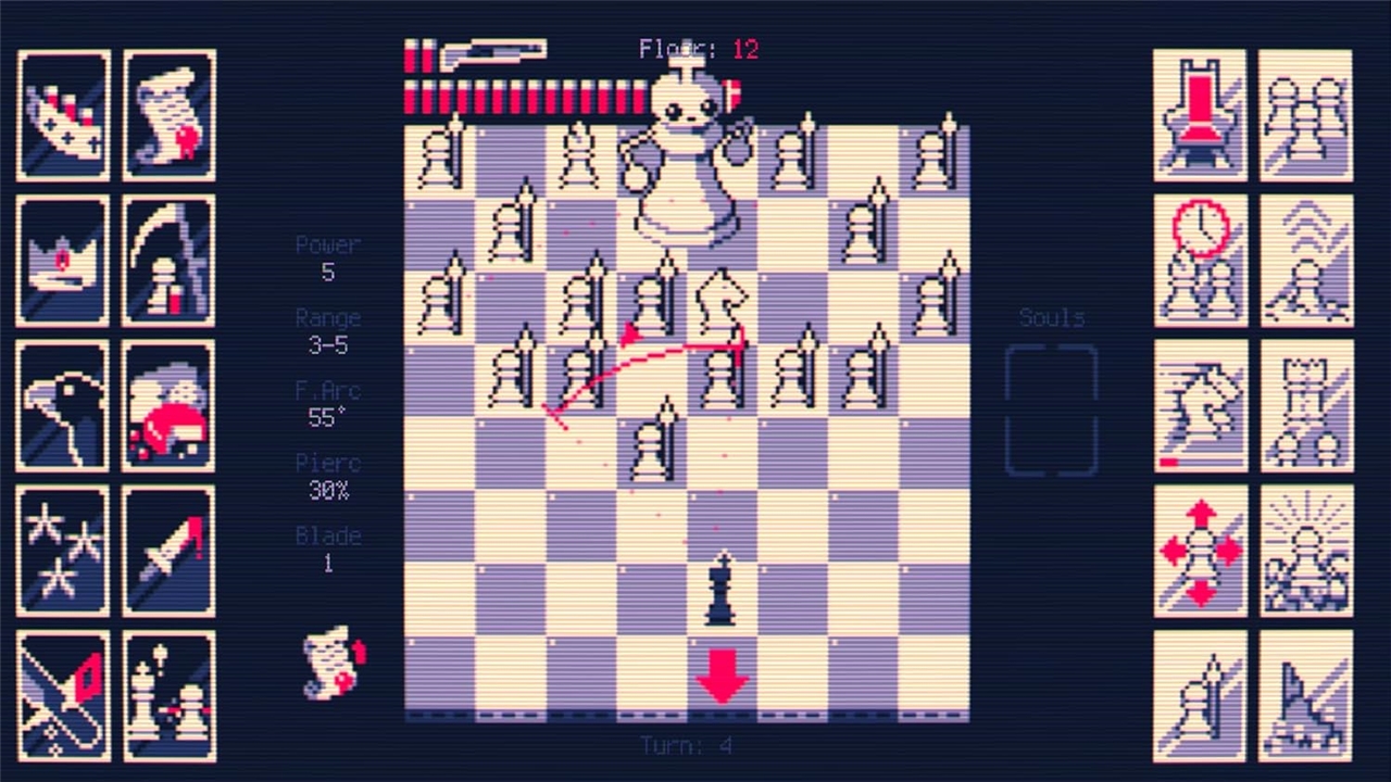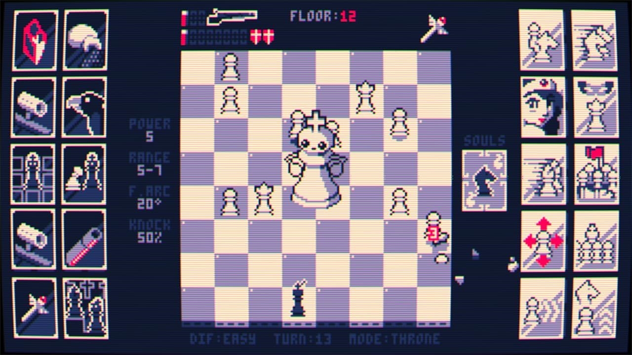 În fiecare tur poți fie să muți regele, fie să tragi în piesele inamice, apoi trebuie să te miști din nou pentru a reîncărca pușca. Evită șahul și ucide regele inamic pentru a termina nivelul. După fiecare nivel, puteți alege între două combinații aleatorii de un upgrade pentru dvs. și un upgrade pentru cealaltă parte. Alege cu înțelepciune și continuă să câștigi niveluri și s-ar putea să îți recuperezi regatul.