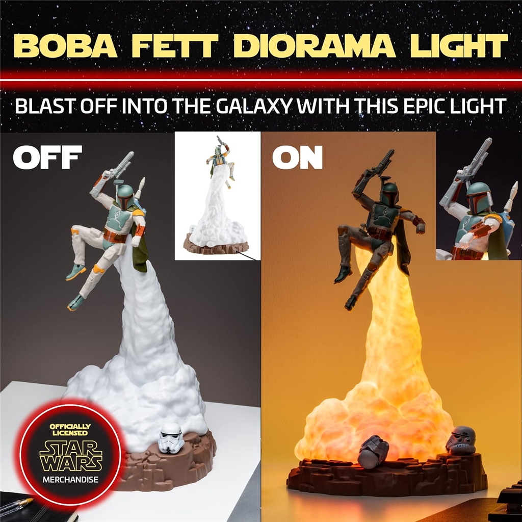 Luminează această lampă foarte detaliată cu un model 3D frumos al lui Boby Fett zburând în amurg. Întregul model oferă un nivel mare de detalii care este o bucurie de descoperit. Lampa este alimentată prin intermediul unui cablu USB și are 3 niveluri de luminozitate reglabile pe care le poți comuta prin rotirea căștii de stormtrooper. Cadoul perfect pentru orice fan al poveștilor din Star Wars.