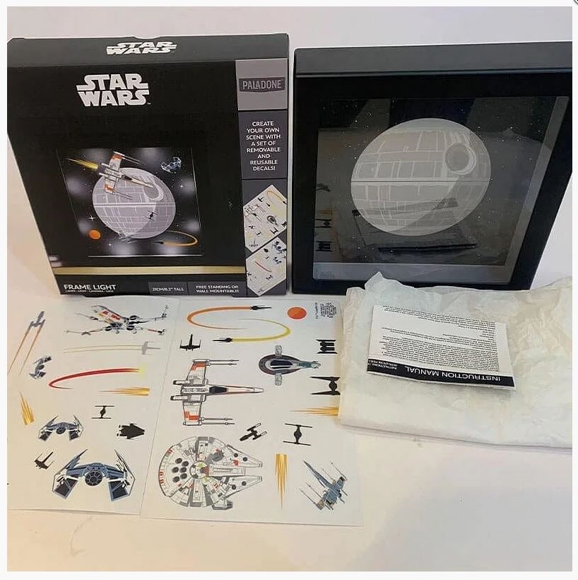 Lampa originală, sub forma unei imagini înrămate a Stelei Morții, poate fi personalizată de tine cu ajutorul imaginilor lipite incluse ale unor nave spațiale din lumea Star Wars. Imaginea este de sine stătătoare sau poate fi atârnată pe perete. Un cadou frumos și o completare pentru casă sau birou. Lampa este alimentată cu 3 baterii AA (nu sunt incluse). 21 x 21. Dimensiuni 21 x 21.