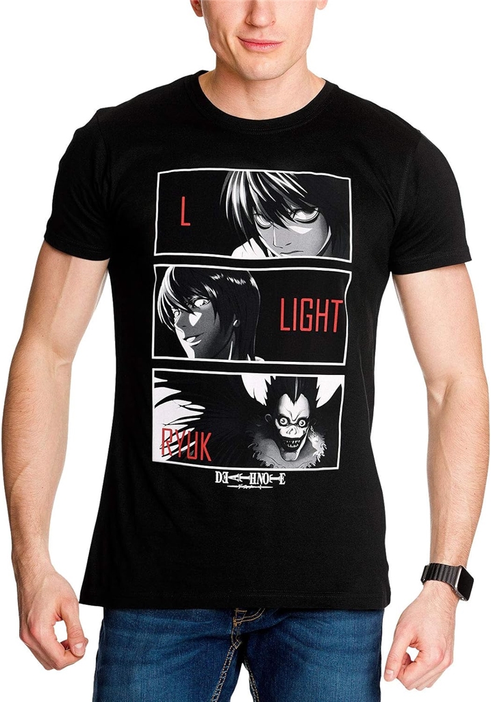 Această croială de bază (croială dreaptă, decolteu rotund și mâneci scurte) este decorată cu un imprimeu inspirat de seria Death Note. Cadoul perfect pentru fanii manga.