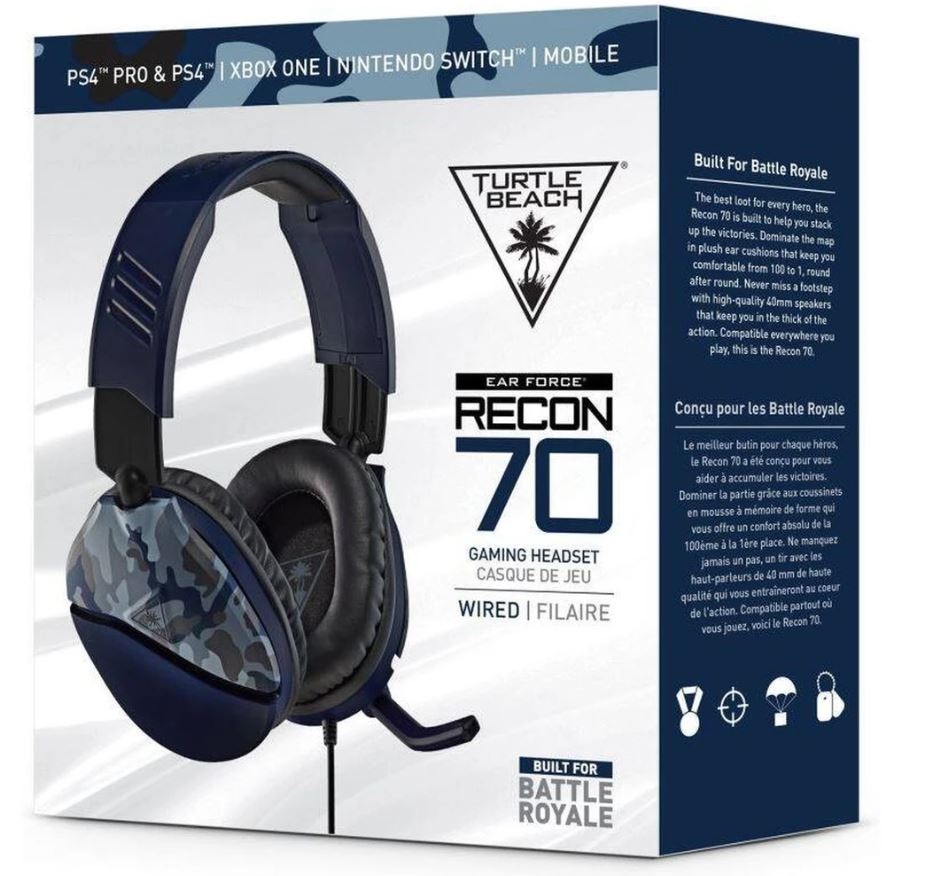 Căști de gaming Turtle Beach Recon 70 cu fir, mufă jack de 3,5 mm, difuzoare mari de 40 mm care oferă un sunet excelent, interval de frecvență 20 Hz - 20 kHz, microfon reglabil și detașabil, comenzi pe cablu, compatibilitate universală.