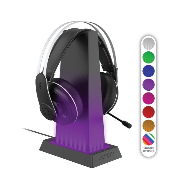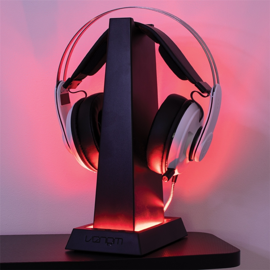 Aduceți lumina în camera de joc cu acest suport uimitor pentru căști cu LED. Suportul se potrivește tuturor tipurilor de căști, este alimentat prin USB și arată grozav lângă orice consolă de jocuri sau computer. Suportul oferă o gamă de 8 culori, precum și controale încorporate pentru luminozitate și tipul de lumină (luminozitate constantă sau pulsatorie). Opțiunile de culoare sunt permanente sau se pot schimba automat în mod spontan. De asemenea, lumina poate fi oprită complet, dacă este necesar. Partea din spate a bazei oferă, de asemenea, un port USB suplimentar care poate fi utilizat pentru a încărca căștile wireless din docul din bază, precum și controllerele și alte dispozitive.