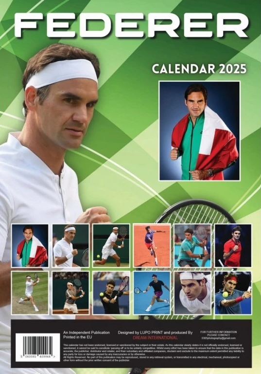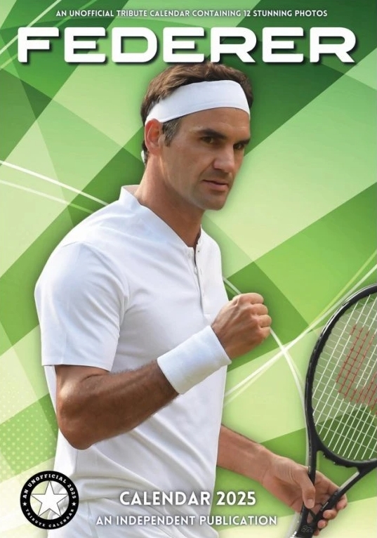 Calendariul oficial de perete de doisprezece luni al tenistului Roger Federer pentru anul 2025.