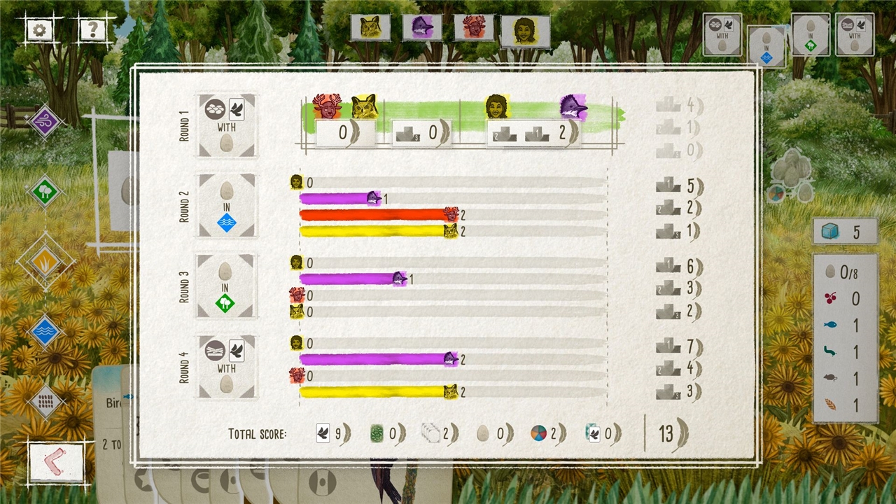Ovarietate de moduri de a obține puncte - pentru specimene de păsări interesante din colecția ta, deținând cărți bonus, depunând ouă, acumulând hrană, îndeplinind obiective în timpul jocului...