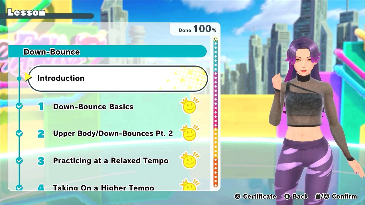 Include o serie de opțiuni care asigură că nu vă veți simți niciodată copleșit. Aveți nevoie să vedeți mai îndeaproape o coregrafie a unei mișcări de dans mai complexe? Schimbați unghiul camerei pe o perspectivă din profil! Vă simțiți bine cu ce ați realizat? Dați un high-five cu instructorul și obțineți niște ștampile ca recompensă!